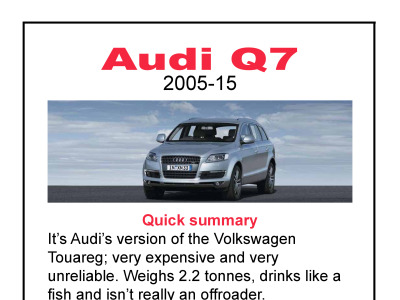 Thoughtful, entertaining and often outrageous, the reviews challenge you to rethink your most basic assumptions about cars and how we use them. You can buy tough, objective, cynical reviews of most popular makes & models of car since about 1980, including most current models.